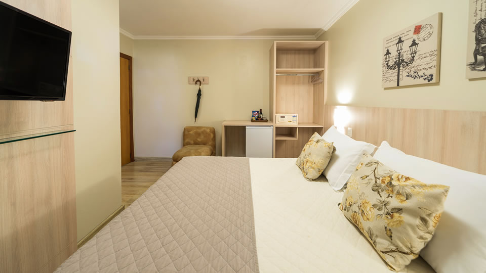 Suítes com 18 m² de área, ideal para duas pessoas em cama de casal ou em duas camas de solteiro.
